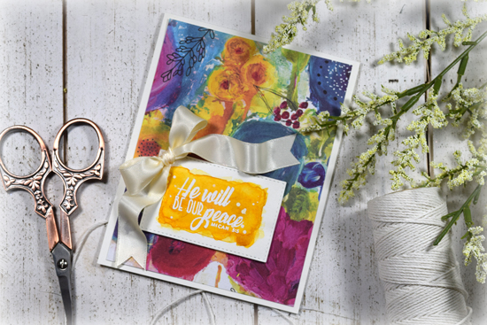 I went with a super simple approach to my card. I loved this paper from a pad I recently picked up at Tuesday Morning and wanted to let as much of it show as possible. It seemed fitting for either a card of encouragement or sympathy, so I chose the Micah 5:5 verse to pair with it.
