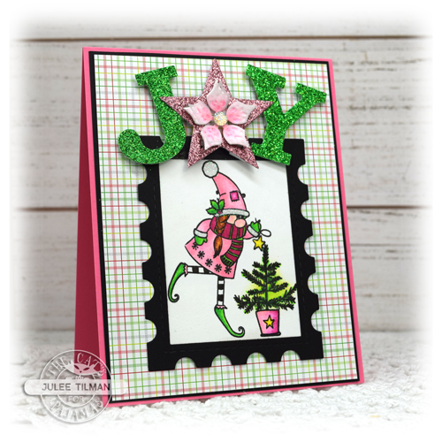 For my card, I pulled out the adorable Gnome for the Holidays set and colored this tree-trimming gnome up in some non-traditional colors. I added a bit of stickles for her stocking cap trim, then matted with a Rectangular Stamp Duo die cut in black.