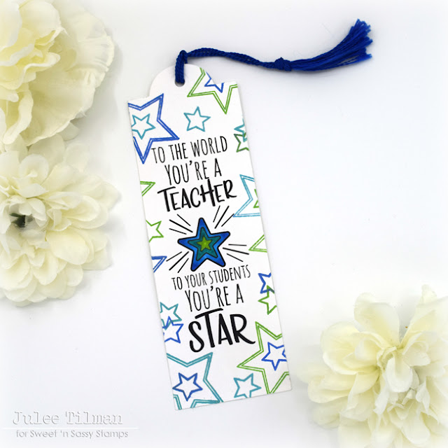 I lined up the two sentiments and the star image to print, then cut with the Bookmarks & More Die Set.  I then stamped the stars from the Back to School stamp set in blues and greens to fill in the space. Then I handed it off to one of my boys with some Copics to color in the star.  A little tassel finishes things off.